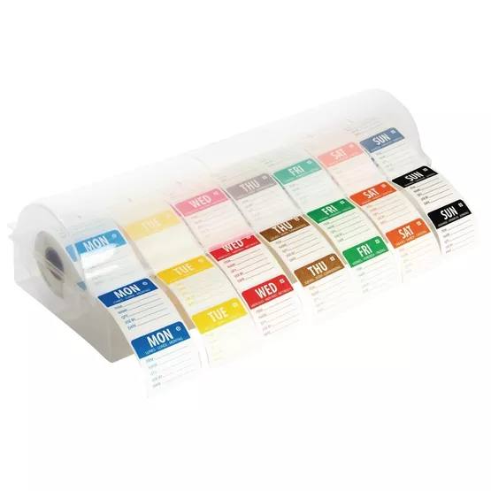 Coloured food labels, a different colour for each day of the week, makes food rotation and identifying stored food a lot easier. Rather than going through to read the days printed on each label, coloured day labels will help you to simply find what you need, saving you time and ensuring that your stock is fresh and in the best consumable condition.