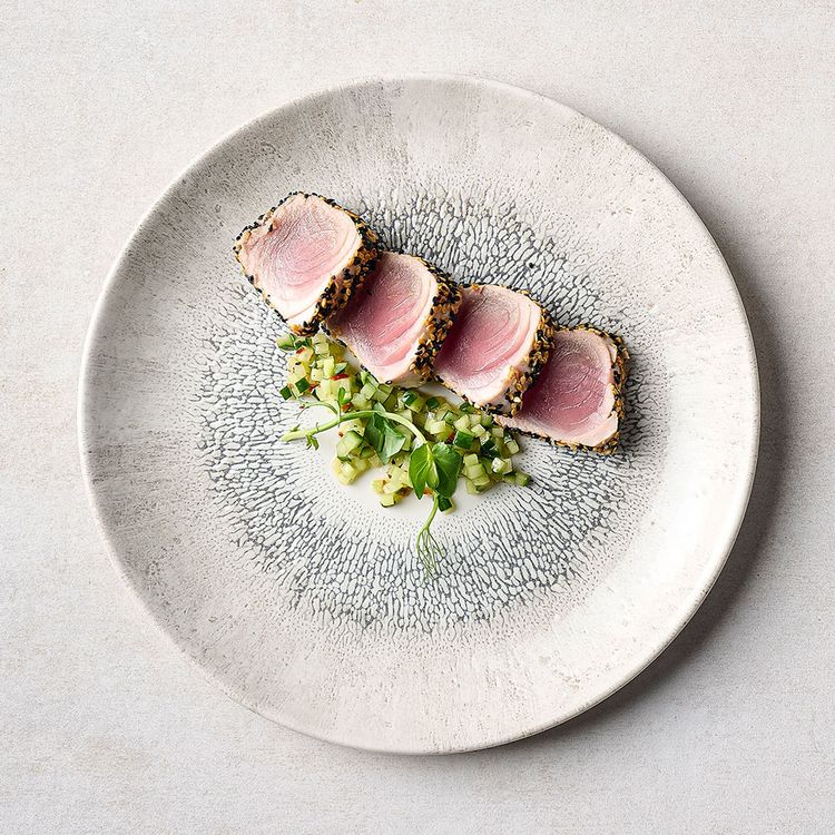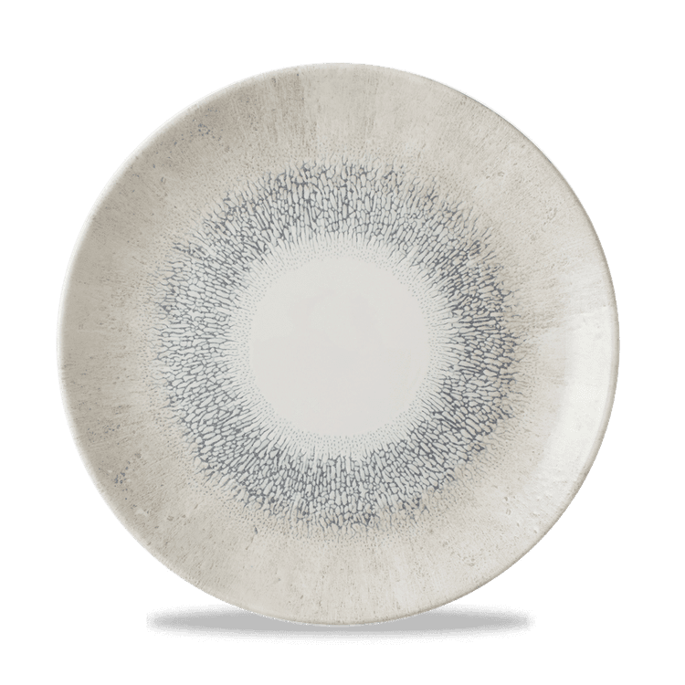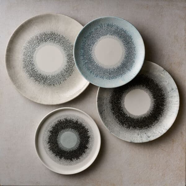 Studio Prints Fusion showcases a textured border effect, inspired by the fusion of multi-tonal reactive glazes. Radial and expressive, this design blends colour and texture with a contemporary white centre, ideal for framing premium food presentation.