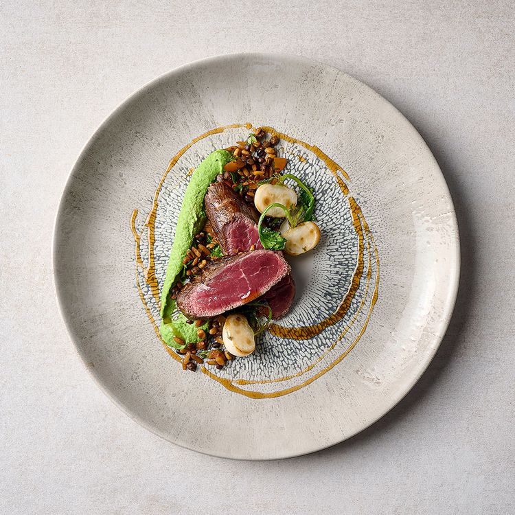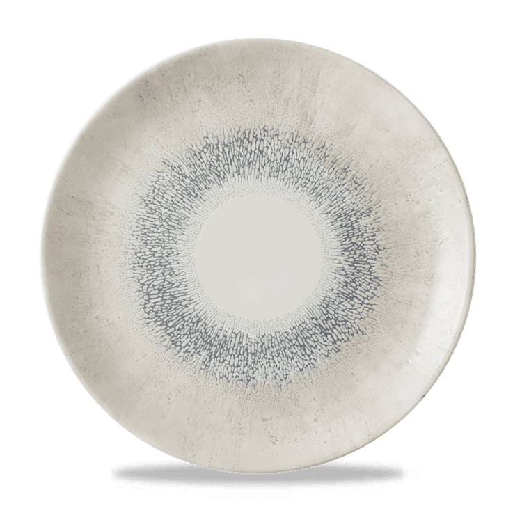 Studio Prints Fusion showcases a textured border effect, inspired by the fusion of multi-tonal reactive glazes. Radial and expressive, this design blends colour and texture with a contemporary white centre, ideal for framing premium food presentation.