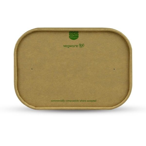 Kraft paper lid for rectangular kraft food containers. Keep your food warm by popping this lid on. Made from sustainably-sourced kraft board with a water-based lining. Brown kraft with green Vegware messaging. Award-winning quality by Vegware, made from plants. Designed for industrial composting, made from recyclable materials.