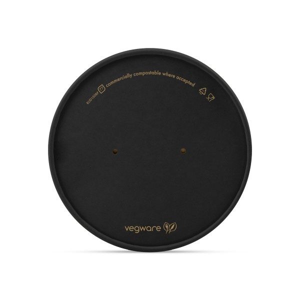 Black kraft paper lid for 150-Series food containers. Perfect for keeping your street food servings warm. Made from sustainably-sourced kraft paper. Black & brown kraft with Vegware messaging. Award-winning quality by Vegware, made from plants. Designed for industrial composting, made from recyclable materials.