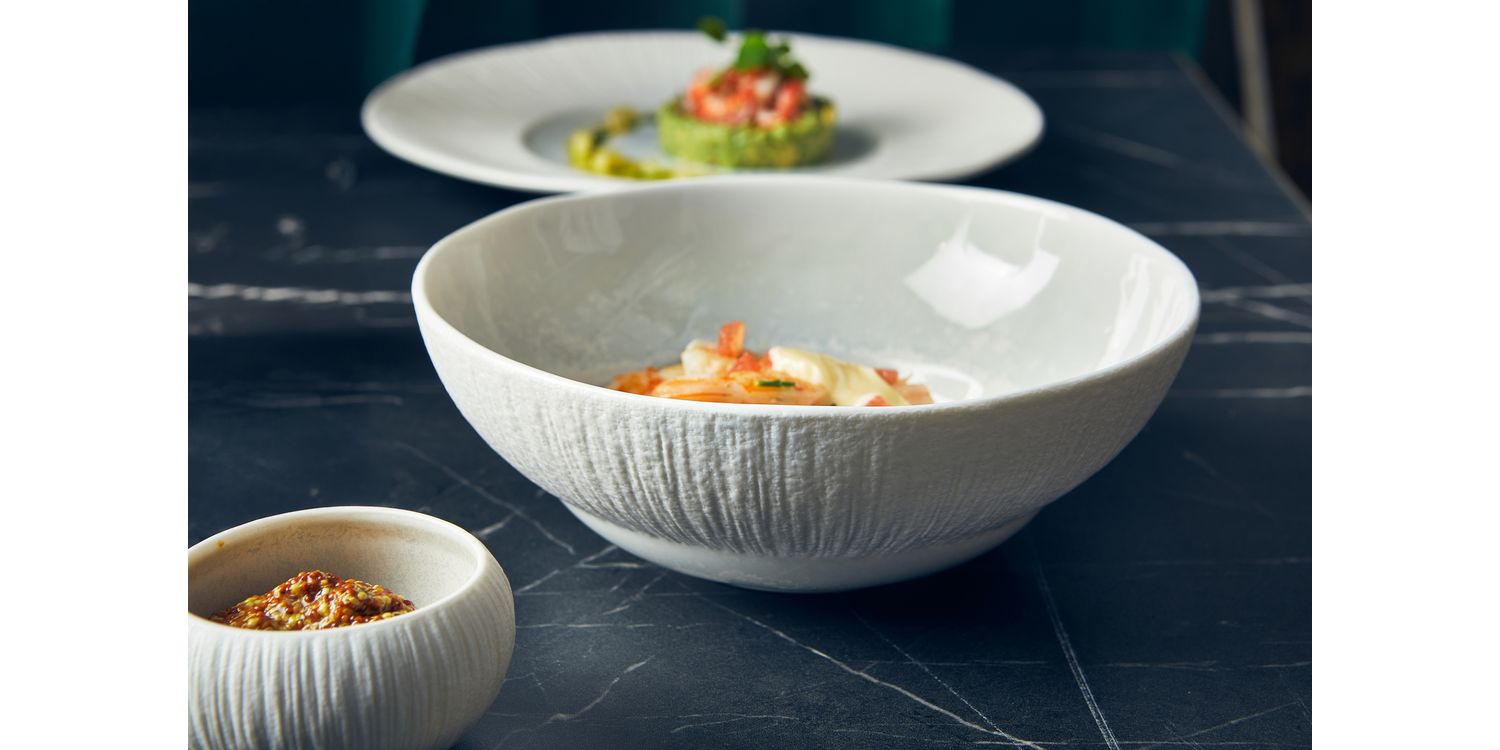The Incise Porcelain Lucine collection features an elegant series of gourmet dishes, finished with a refined textured matt white glaze and embossed design for added sophistication. The centre of each plate showcases a stunning reactive pearlescent glaze, creating a captivating focal point. Perfect for upscale settings, this range blends striking aesthetics with practical design, allowing chefs to create visually stunning and memorable presentations for any occasion.