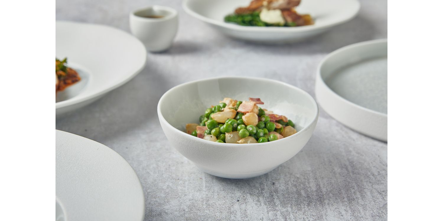The Incise Porcelain Lustre collection features an elegant series of gourmet dishes, finished with a refined textured matt white glaze for added sophistication. The centre of each plate showcases a stunning reactive pearlescent glaze, creating a captivating focal point. Perfect for upscale settings, this range blends striking aesthetics with practical design, allowing chefs to create visually stunning and memorable presentations for any occasion.