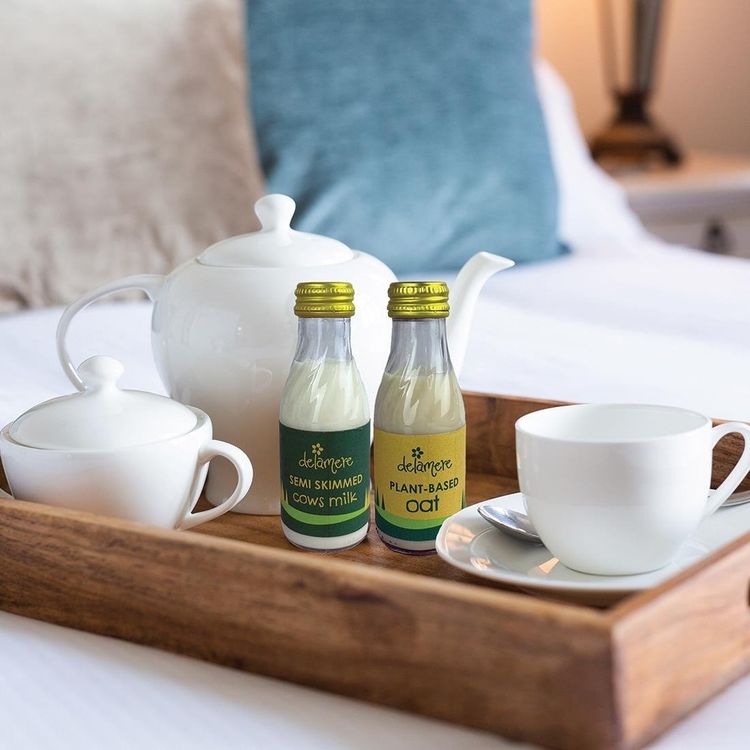 Designed for hospitality settings, Delamere Dairy's mini milk bottles are perfect for hotel room trays, and anywhere you would serve milk to guests. Reduce your plastic waste with these fully recyclable glass bottles with re-closable aluminium lids and save time instead of serving milk on request. The milk is semi-skimmed cows' milk and can be used in hot drinks as well as on cereal, each 97ml bottle provides 3-4 servings. The product is long life and can be stored and served at room temperature.