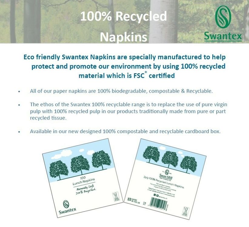 Our Eco-friendly Swantex Napkins are specially manufactured to help protect the environment by using 100% recycled material which is FSC certified.
