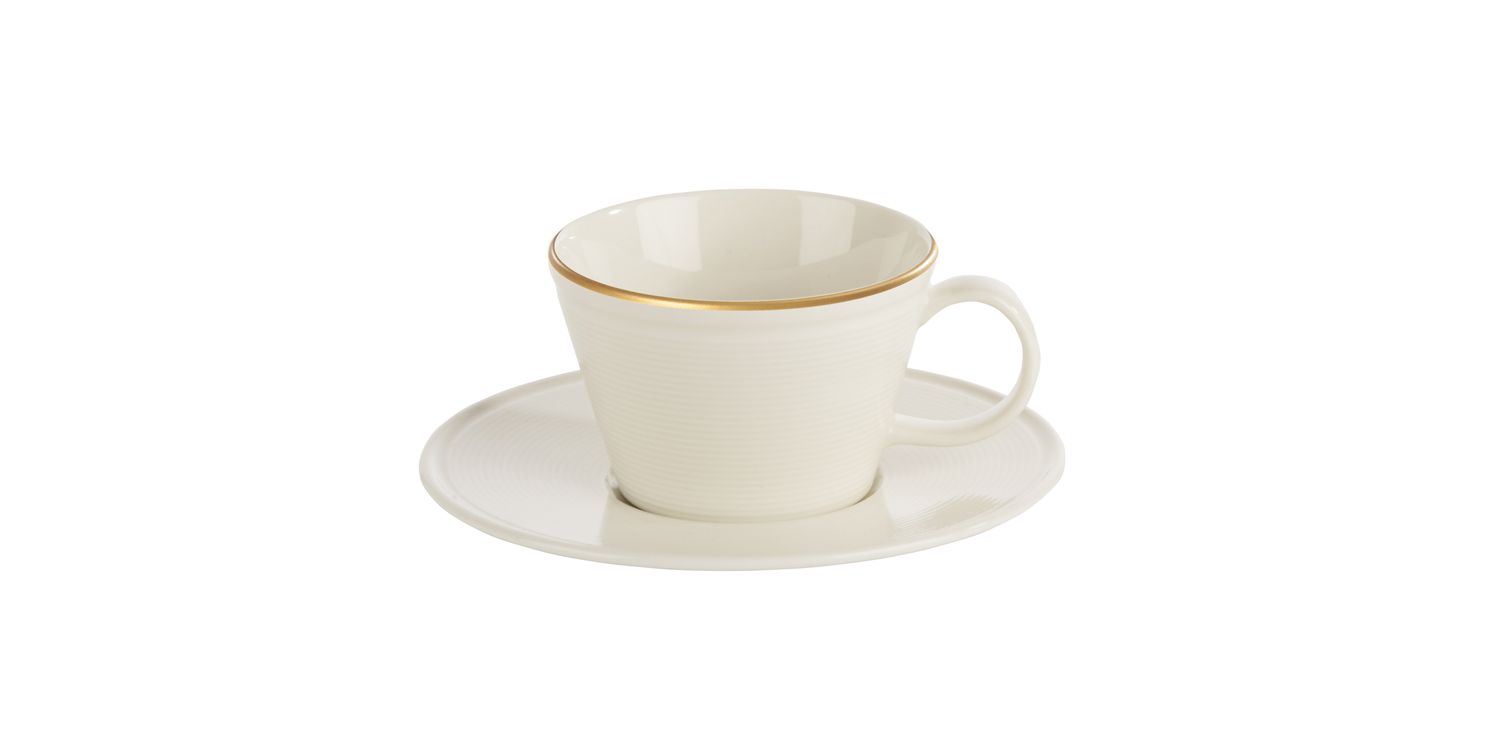 Porland Academy Line Gold Colour Band provides a luxurious take on the original Line collection. The popular classic shapes and styles still feature the concentric, ringed detailing but with the addition of an elegant gold band around the outer edge contributing further to the sophistication of fine dining and banqueting events.