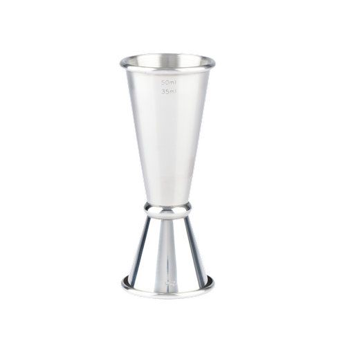 This high-quality stainless steel jigger provides a reliable, dual-purpose solution for busy hospitality environments. Designed with a central band for a secure grip, this essential bar tool allows for the swift and accurate measurement of spirits, ensuring consistent serves and effective portion control during high-volume shifts.